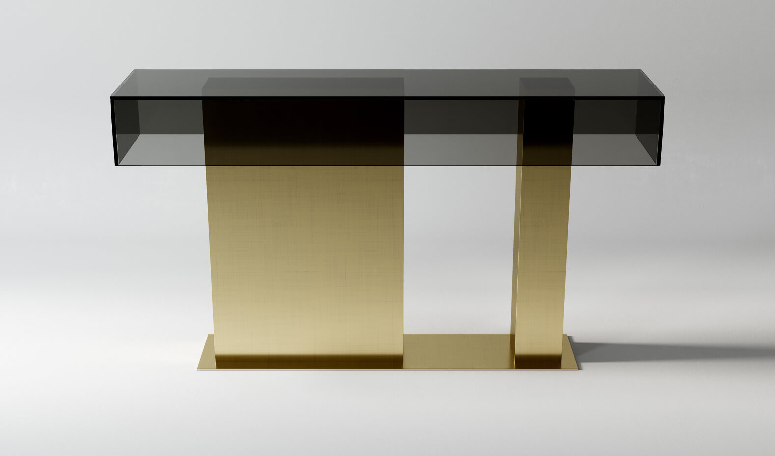 Консоль с подчёркнутой горизонталью и контрастной опорной структурой. Прозрачная плоскость визуально облегчает объект, позволяя металлу работать как архитектурной основе, а не массе.