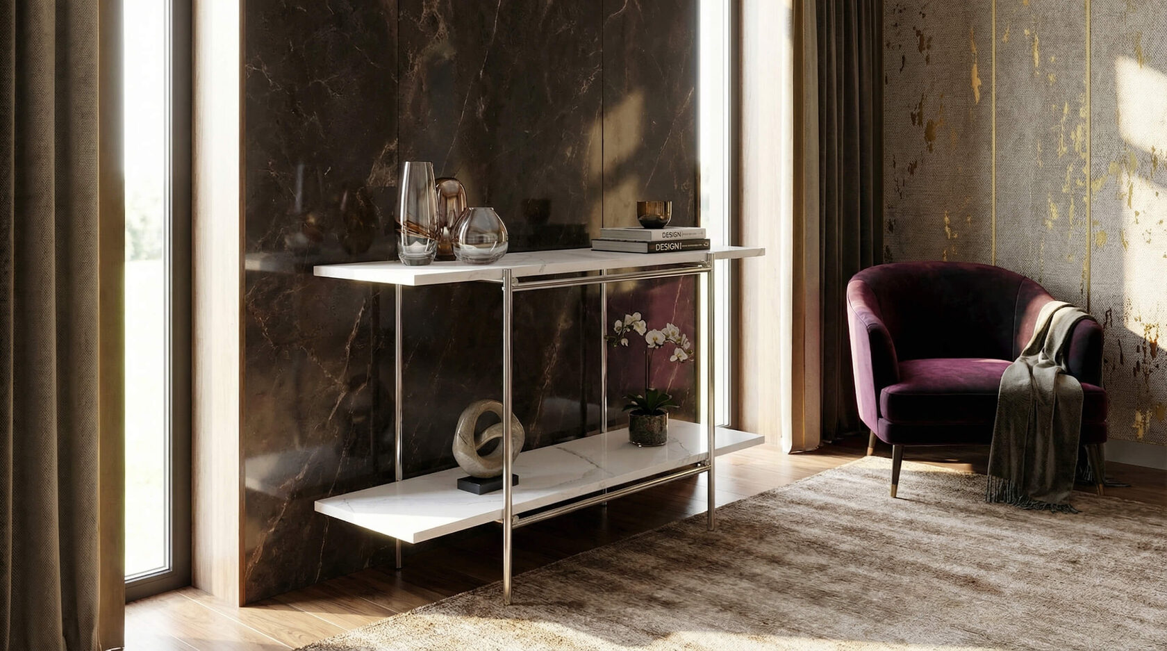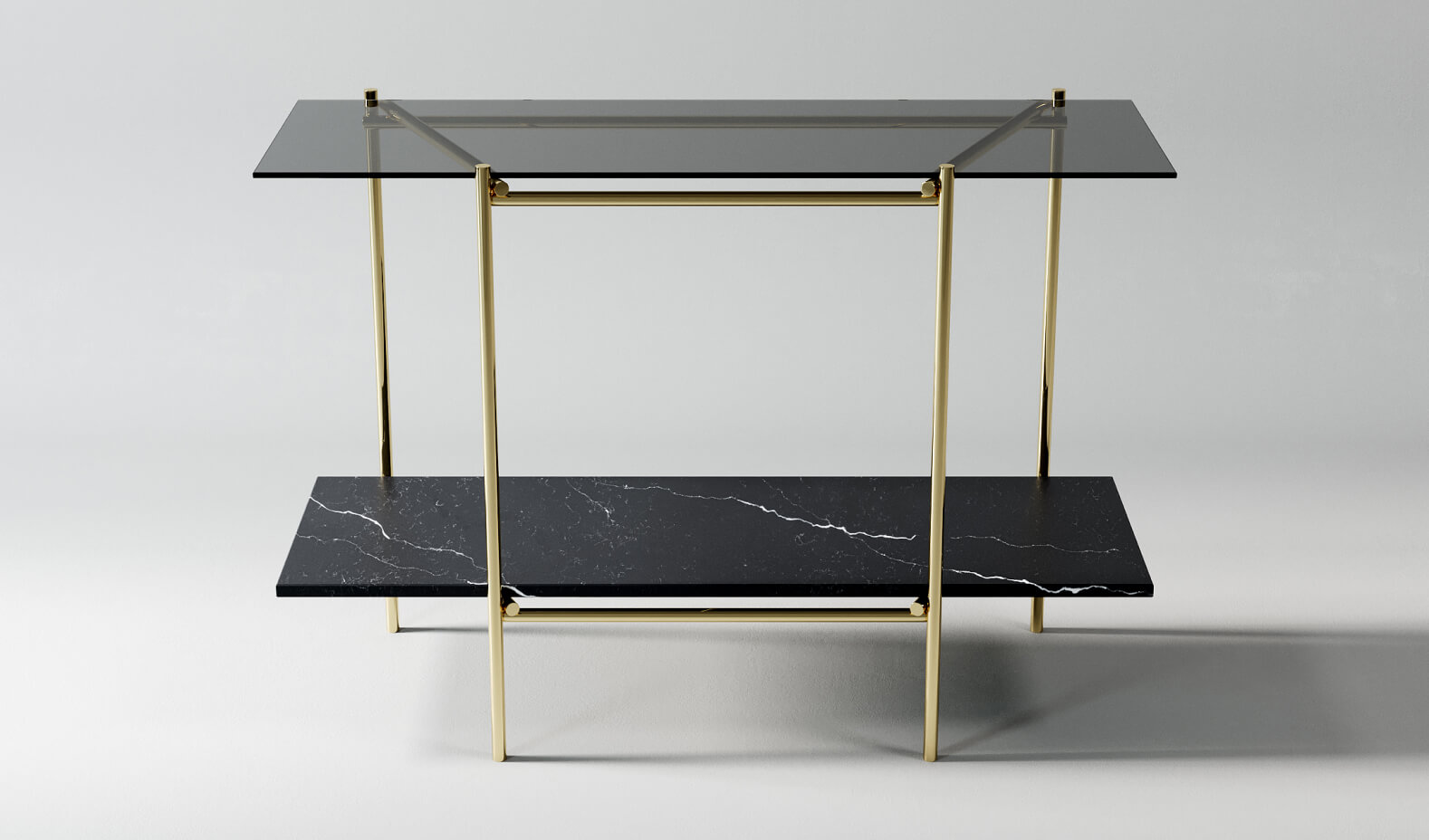 Консоль, выстроенная вокруг идеи открытого объёма. Две горизонтали — стеклянная и каменная — соединены тонким металлическим каркасом, формируя ощущение воздуха, глубины и конструктивной ясности.