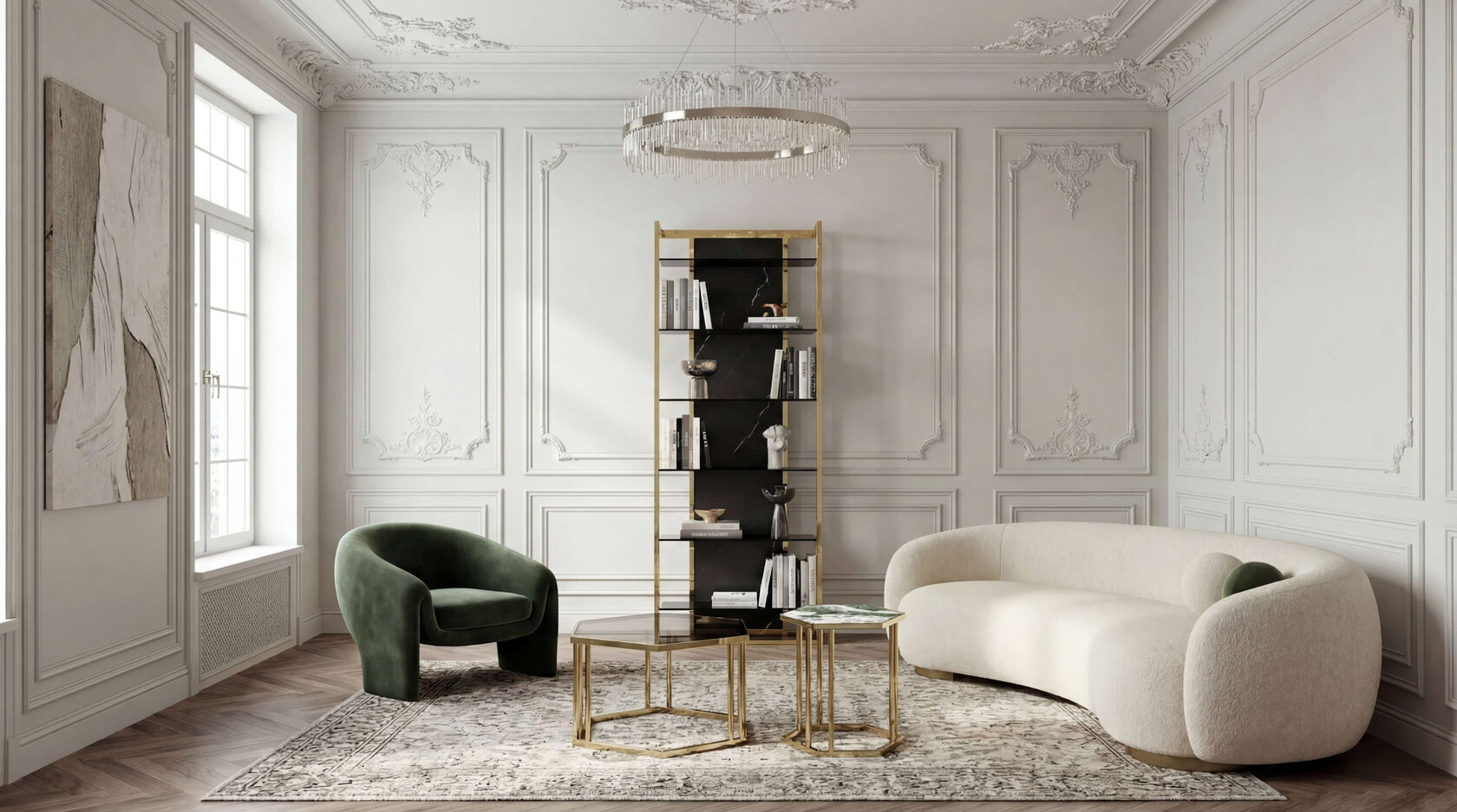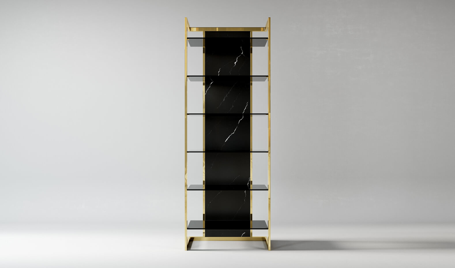 Стеклянные полки словно парят в пространстве, сохраняя ощущение лёгкости, при этом вся конструкция остаётся устойчивой и сбалансированной. Это не просто система хранения — это акцент, который формирует интерьер и задаёт ему масштаб.