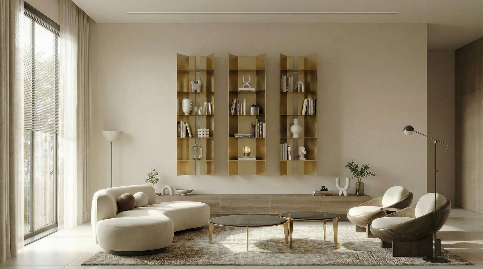 Металлические панели отражают свет, усиливая игру бликов и подчёркивая фактуру поверхности. PAVILY становится акцентом пространства — графичным, монументальным и визуально лёгким одновременно.
